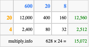 Finally, we add up all the sums we found in step 3 to get our final answer to 628 times 24.