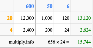 Finally, we add up all the sums we found in step 3 to get our final answer to 656 times 24.