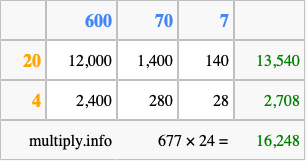 Finally, we add up all the sums we found in step 3 to get our final answer to 677 times 24.