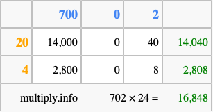 Below is an illustration showing you how to calculate 702 times 24 using the box method, using the instructions above.