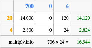 Finally, we add up all the sums we found in step 3 to get our final answer to 706 times 24.