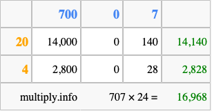 That's all there is to it! As you can see from the box above, the answer to 707 times 24 using the box method is 16,968.