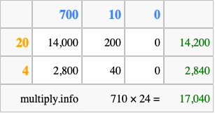 Below is an illustration showing you how to calculate 710 times 24 using the box method, using the instructions above.