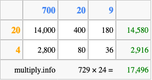 That's all there is to it! As you can see from the box above, the answer to 729 times 24 using the box method is 17,496.
