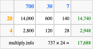 Finally, we add up all the sums we found in step 3 to get our final answer to 737 times 24.
