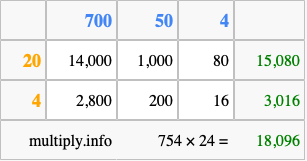 Finally, we add up all the sums we found in step 3 to get our final answer to 754 times 24.
