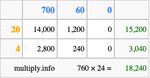 That's all there is to it! As you can see from the box above, the answer to 760 times 24 using the box method is 18,240.