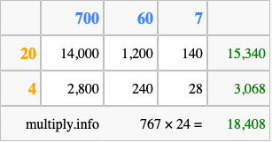 That's all there is to it! As you can see from the box above, the answer to 767 times 24 using the box method is 18,408.