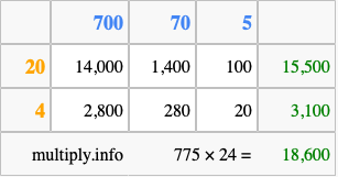 Below is an illustration showing you how to calculate 775 times 24 using the box method, using the instructions above.