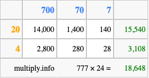 That's all there is to it! As you can see from the box above, the answer to 777 times 24 using the box method is 18,648.