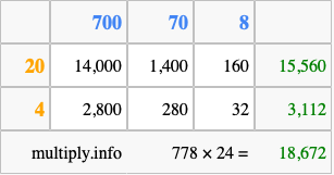 That's all there is to it! As you can see from the box above, the answer to 778 times 24 using the box method is 18,672.