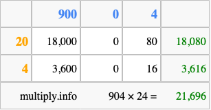 That's all there is to it! As you can see from the box above, the answer to 904 times 24 using the box method is 21,696.