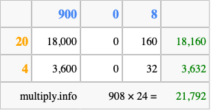 That's all there is to it! As you can see from the box above, the answer to 908 times 24 using the box method is 21,792.
