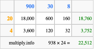 That's all there is to it! As you can see from the box above, the answer to 938 times 24 using the box method is 22,512.
