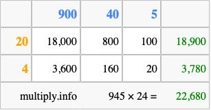 Below is an illustration showing you how to calculate 945 times 24 using the box method, using the instructions above.