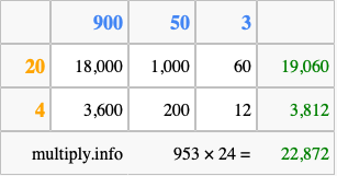Below is an illustration showing you how to calculate 953 times 24 using the box method, using the instructions above.