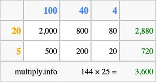 Finally, we add up all the sums we found in step 3 to get our final answer to 144 times 25.
