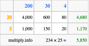 Finally, we add up all the sums we found in step 3 to get our final answer to 234 times 25.