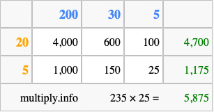 Below is an illustration showing you how to calculate 235 times 25 using the box method, using the instructions above.