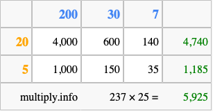 Below is an illustration showing you how to calculate 237 times 25 using the box method, using the instructions above.