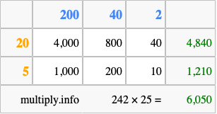 Finally, we add up all the sums we found in step 3 to get our final answer to 242 times 25.