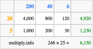 Finally, we add up all the sums we found in step 3 to get our final answer to 246 times 25.