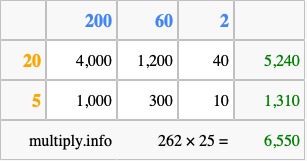 Finally, we add up all the sums we found in step 3 to get our final answer to 262 times 25.