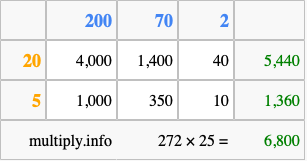 Below is an illustration showing you how to calculate 272 times 25 using the box method, using the instructions above.
