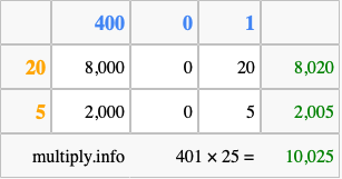 Finally, we add up all the sums we found in step 3 to get our final answer to 401 times 25.