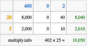 Below is an illustration showing you how to calculate 402 times 25 using the box method, using the instructions above.