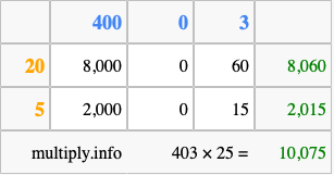 Finally, we add up all the sums we found in step 3 to get our final answer to 403 times 25.