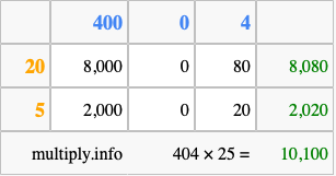 Finally, we add up all the sums we found in step 3 to get our final answer to 404 times 25.