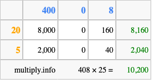 Below is an illustration showing you how to calculate 408 times 25 using the box method, using the instructions above.