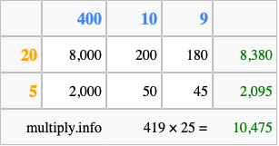 Below is an illustration showing you how to calculate 419 times 25 using the box method, using the instructions above.
