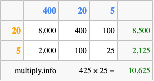 Below is an illustration showing you how to calculate 425 times 25 using the box method, using the instructions above.