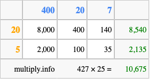 Below is an illustration showing you how to calculate 427 times 25 using the box method, using the instructions above.