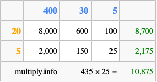 Below is an illustration showing you how to calculate 435 times 25 using the box method, using the instructions above.