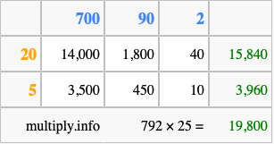 Below is an illustration showing you how to calculate 792 times 25 using the box method, using the instructions above.