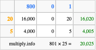 Below is an illustration showing you how to calculate 801 times 25 using the box method, using the instructions above.