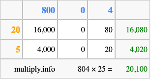 Below is an illustration showing you how to calculate 804 times 25 using the box method, using the instructions above.