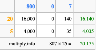 Below is an illustration showing you how to calculate 807 times 25 using the box method, using the instructions above.