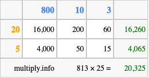 Below is an illustration showing you how to calculate 813 times 25 using the box method, using the instructions above.