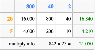 Below is an illustration showing you how to calculate 842 times 25 using the box method, using the instructions above.