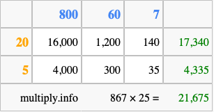 Finally, we add up all the sums we found in step 3 to get our final answer to 867 times 25.