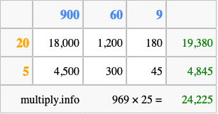 Finally, we add up all the sums we found in step 3 to get our final answer to 969 times 25.