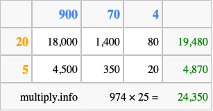 Below is an illustration showing you how to calculate 974 times 25 using the box method, using the instructions above.