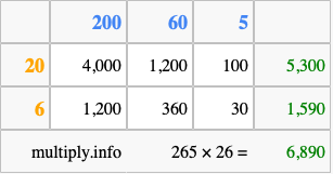 That's all there is to it! As you can see from the box above, the answer to 265 times 26 using the box method is 6,890.
