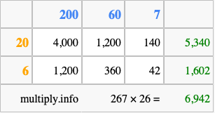 That's all there is to it! As you can see from the box above, the answer to 267 times 26 using the box method is 6,942.
