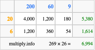 That's all there is to it! As you can see from the box above, the answer to 269 times 26 using the box method is 6,994.
