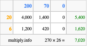 That's all there is to it! As you can see from the box above, the answer to 270 times 26 using the box method is 7,020.